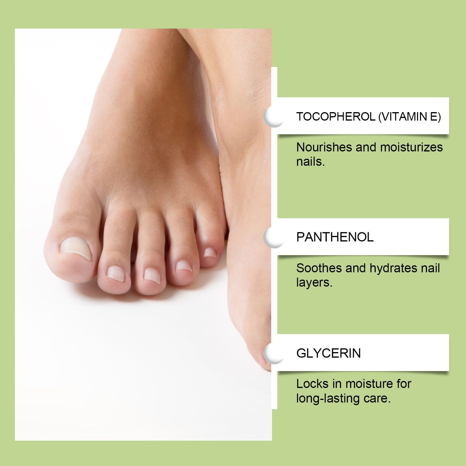 Active ingredients: Tocopherol (Vitamin E), Panthenol, Allantoin